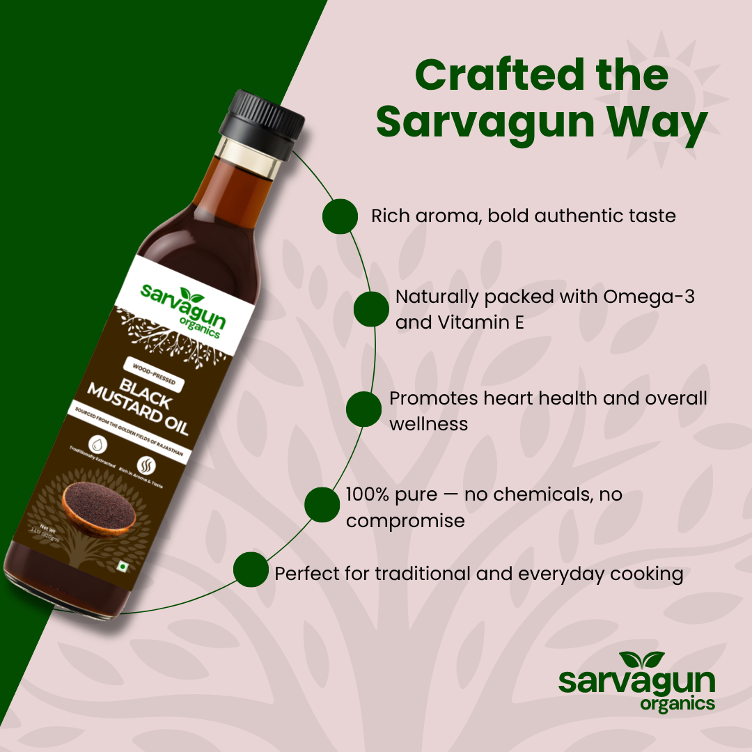 Sarvagun Organics Black Mustard Oil is a traditionally crafted, wood-pressed oil made from the finest black mustard seeds. Extracted through a slow, cold-press process, it retains its natural aroma, sharp flavor, and essential nutrients without any chemicals or refining.